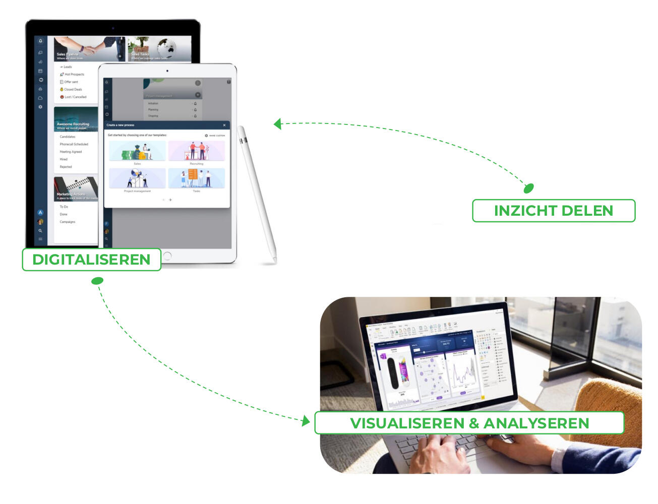 DIGITIZE > ANALYZE > VISUALIZEAfter digitizing your business processes, the next crucial step begins: analyzing and visualizing . This is where data is transformed into valuable insights that can be shared with your team and stakeholders. The goal is to not only gain insight into what is happening within your organization, but also to make these insights understandable and actionable.
